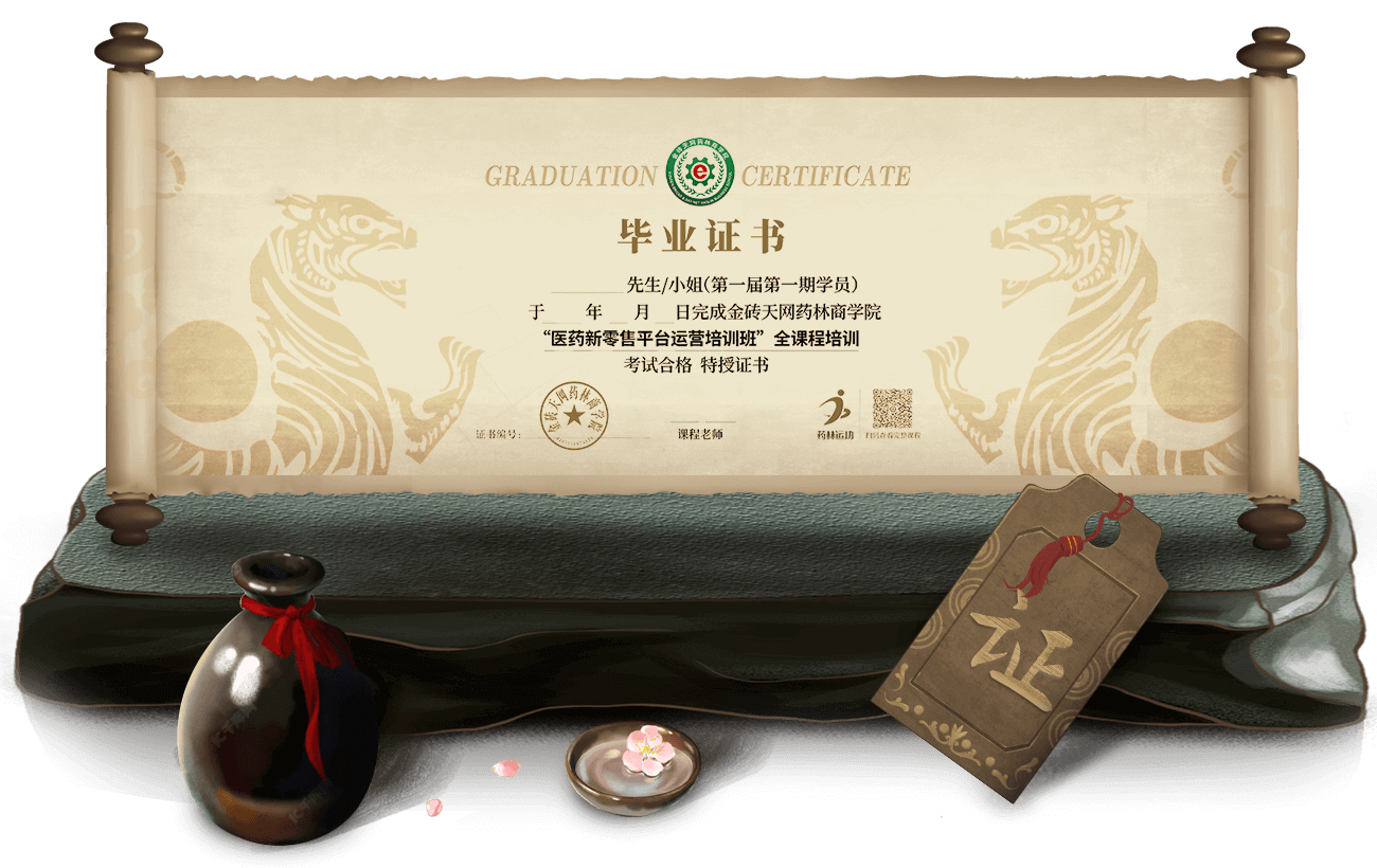 《药林商学院》毕业证书由金砖天网颁发,受广大药企认可,学员可凭借该证书申请医药批发公司以及连锁药店互联网运营岗位,是岗位聘用、任职、加薪和职务晋升的重要依据。